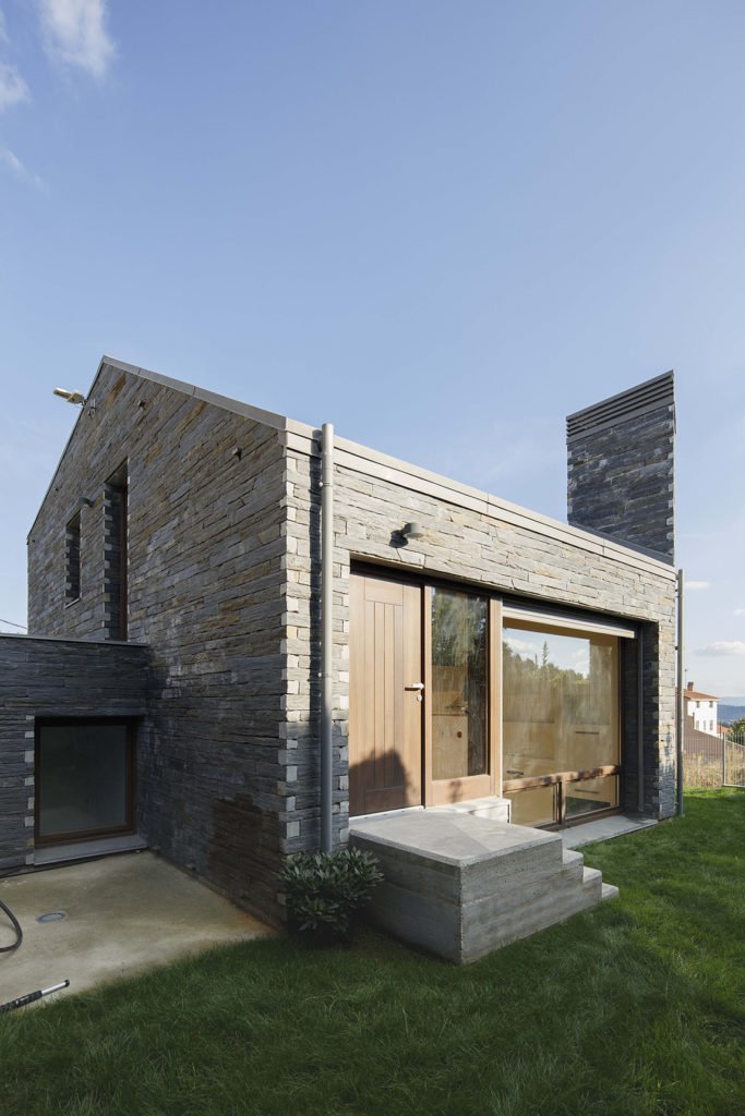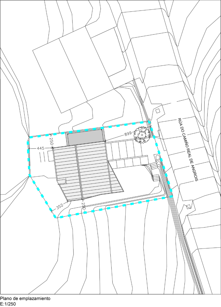 La parcela está junto al Camino (Vía de la Plata), en su entrada al ámbito urbano de la ciudad de Santiago de Compostela. Se trata de una zona híbrida entre lo rural y lo urbano. Asimismo la propia topografía de la zona hace que, en relación al Camino, la nueva edificación, a pesar de retranquearse de la alineación de la calle, se haga muy visible y se muestre como un elemento importante dentro de un entorno que es la antesala de una zona más urbana. Esta circunstancia ha condicionado de manera sustancial los aspectos relacionados con la volumetría, la composición y materialidad de la nueva pieza.