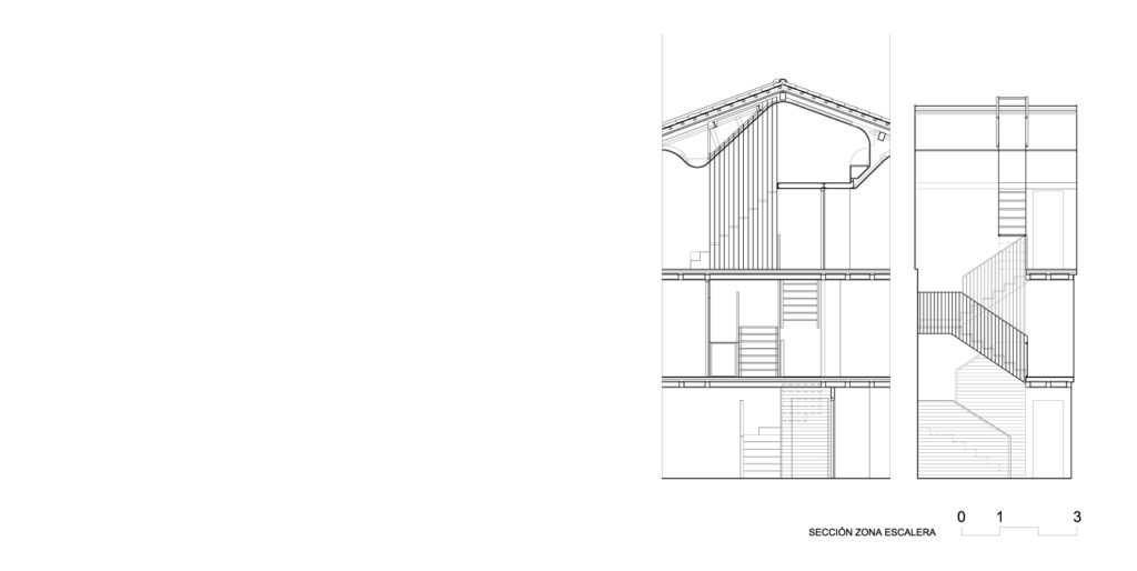 La nueva escalera ocupa la posición de la existente y se va aligerando a medida que asciende por el hueco, por el que entra luz cenital a las diferentes plantas. La construcción de cada tramo la de escalera, desde la caja cerrada al elemento ligero que cuelga de la estructura de cubierta, se relaciona con el distinto carácter de cada uno de los pisos. Esta estratificación tiene su correspondencia en el nuevo elemento adosado a la fachada trasera a través del que se produce la relación con el jardín: espacio exterior cubierto, galería-corredor y terraza.